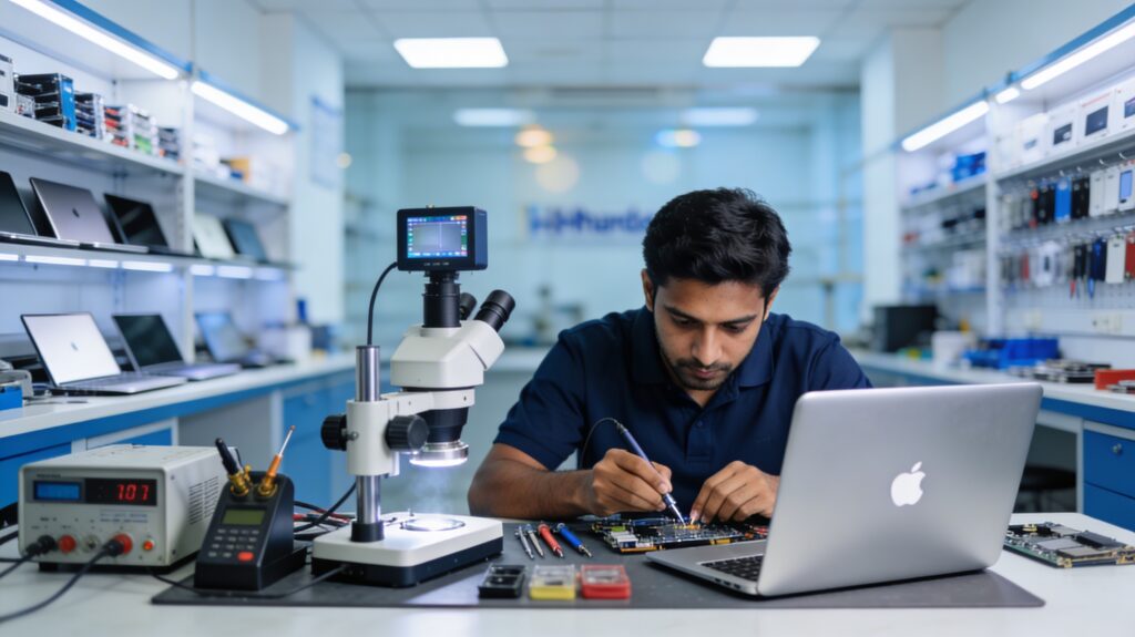 Laptops, MacBooks, Mobiles, Tablets, Printers — certified technicians, 90-day warranty, free pickup & delivery across Hyderabad.